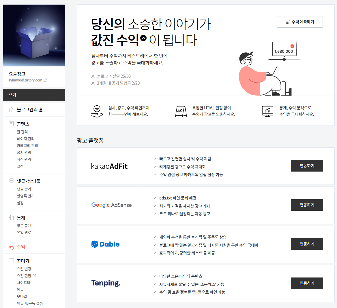 그래서 만약 티스토리를 한다고 하신다면 생각할 필요도 없이 구글 광고를 탑재하는게 가장 좋습니다.