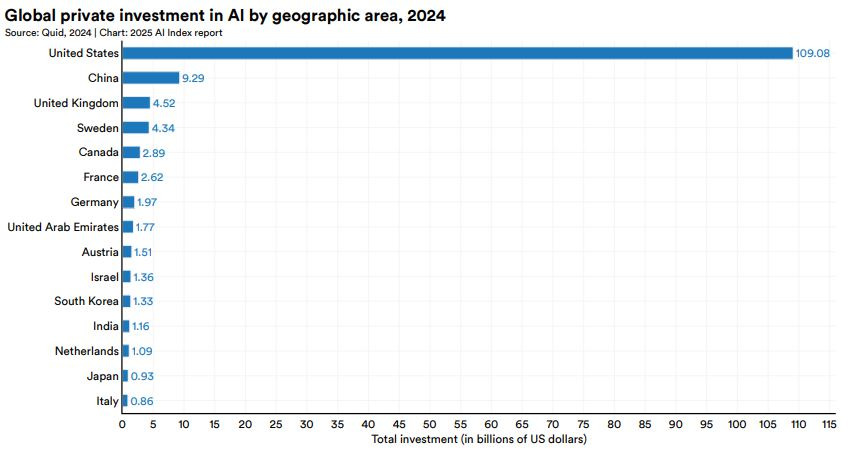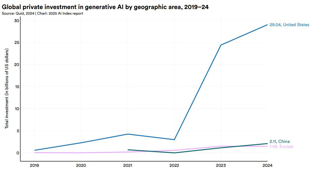 미국은 생성형 AI 분야에서도 압도적인 우위를 보였다. 2024년 미국의 생성형 AI 민간 투자액은 약 290억4000만 달러로, 전 세계 투자액(약 339억 달러)의 대부분을 차지했다. 이 수치는 중국, EU, 영국의 투자액을 모두 합친 금액보다 약 254억 달러 많으며, 2023년 대비 격차가 더 커졌다. 또한 2024년에 새로 자금을 조달한 AI 기업 수는 1073개로, 지난 10년간 누적 기준 중국의 4.3배, 영국의 7.9배에 달하는 것으로 나타났다.