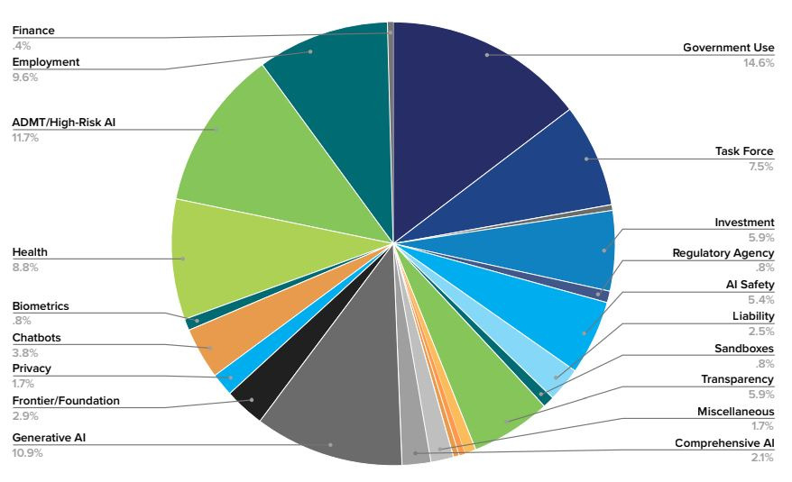 주정부 차원에서도 AI 관련 입법이 활발히 진행 중이다. 미국의 비영리 싱크탱크 기관으로 기술 거버넌스 분야의 정책을 분석하는 ‘Future of Privacy Forum’이 2025년 10월에 발표한 “The State of State AI” 보고서에 의하면, 2025년에 미국의 42개 주가 민간 부문의 AI 개발 및 활용에 직접 영향을 줄 수 있는 법안 약 210건을 발의했고, 이 중 약 8~10% 정도가 제정된 것으로 파악됐다. 아래 그래프는 2025년 주정부 차원의 AI 입법이 정부 활용, 고위험∙생성형 AI, 고용 등 공공성과 윤리 이슈 중심으로 분포하고 있음을 보여준다. 전체적으로 AI가 미치는 사회적 영향 관리에 초점이 맞춰져 있으며, 이는 AI 기술을 직접적으로 규제하기보다는 사용 환경과 위험 등급에 따른 관리 체계 구축을 중시하는 입법 경향을 반영한다.