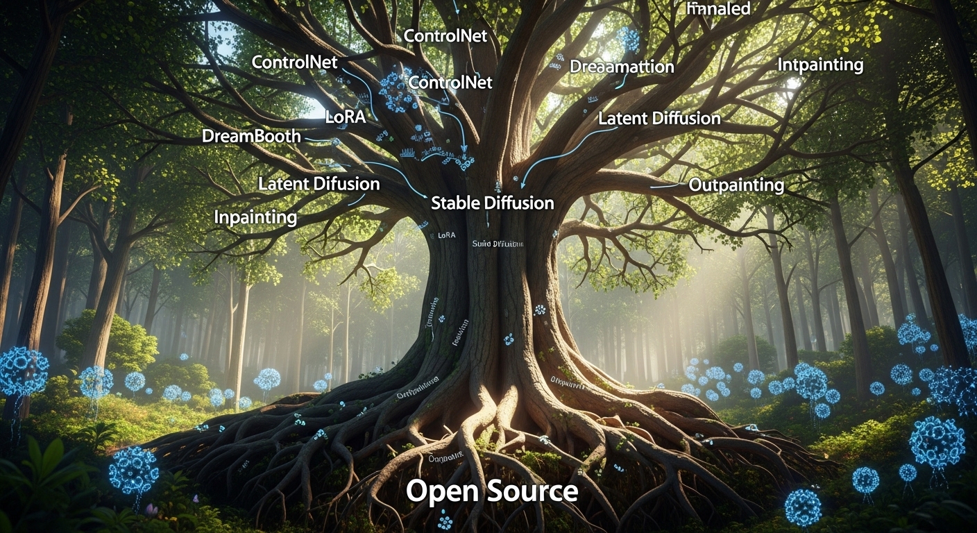 오픈소스로 풀린 Stable Diffusion은 거대한 AI 생태계를 탄생시켰습니다. Stability AI가 뿌린 씨앗 위에 전 세계의 개발자들이 모여들어, 원본 모델을 개선하고 상상조차 못 했던 새로운 기능들을 만들어내기 시작했는데요. 웹 브라우저에서 손쉽게 사용할 수 있는 'AUTOMATIC1111'과 같은 인터페이스가 대표적입니다. AI 이미지 생성의 가능성을 무한히 확장시킨 드림부스와 ControlNet 역시 이 오픈소스 AI 생태계가 낳은 위대한 산물입니다.