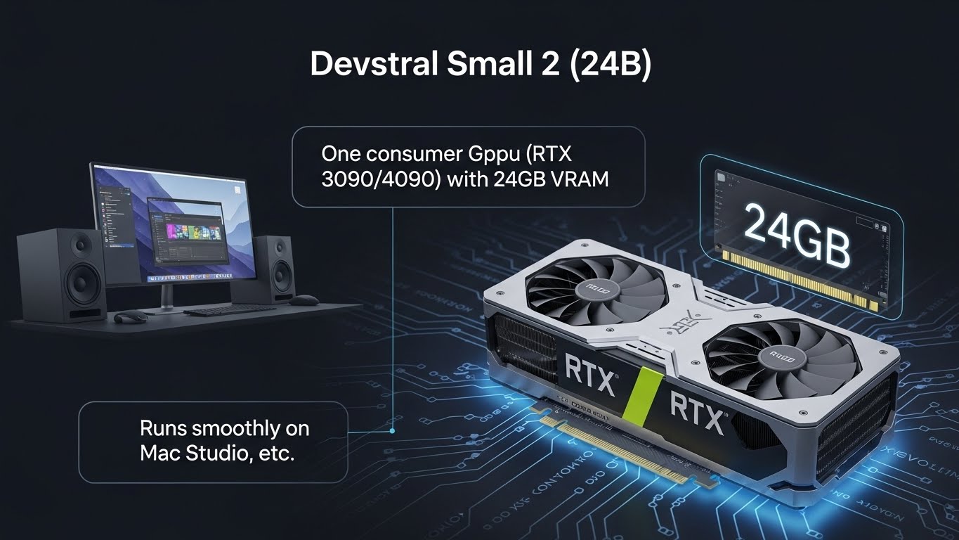 - Devstral Small 2 (24B): 24GB VRAM을 가진 소비자용 GPU(RTX 3090/4090) 한 장, 혹은 Mac Studio 등에서 원활히 구동됩니다.